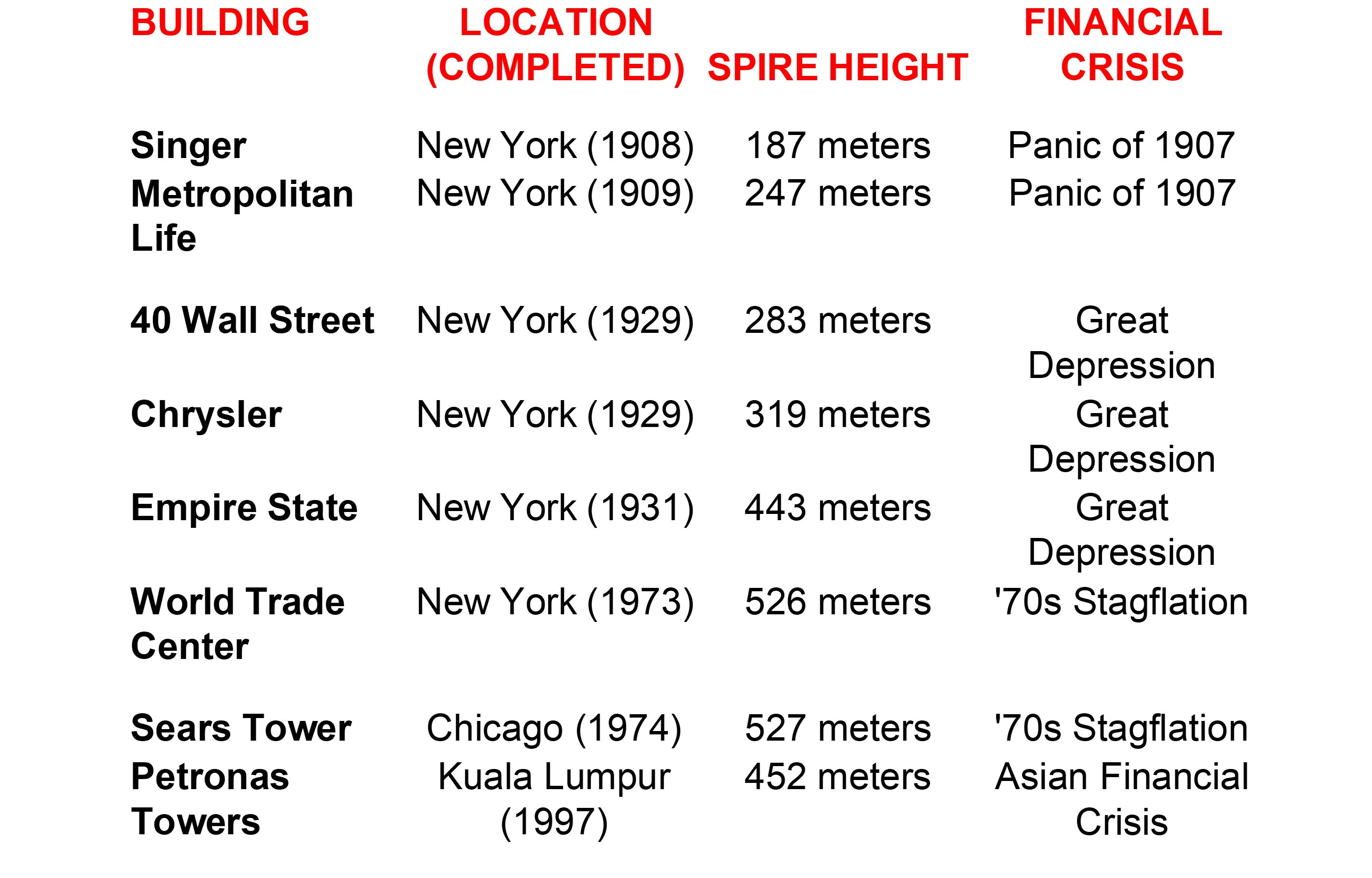 It has also been one of the most robust bubble indicators over long time periods--specifically, the world's tallest skyscraper has been. You may be aware of the Burj Dubai's ascent as the world's tallest structure, and the corresponding global credit crunch that soon followed, but few are as familiar with the consistency of the pattern. Consider the following table, which lists the world's tallest skyscrapers (at the time) and the accompanying financial crisis that struck the market in which it was built.